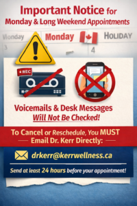 If your appointment is scheduled for a Monday or the day following a long weekend, please note that voicemails and front desk messages are not monitored while the clinic is closed and therefore cannot be considered valid for cancellations or schedule changes.